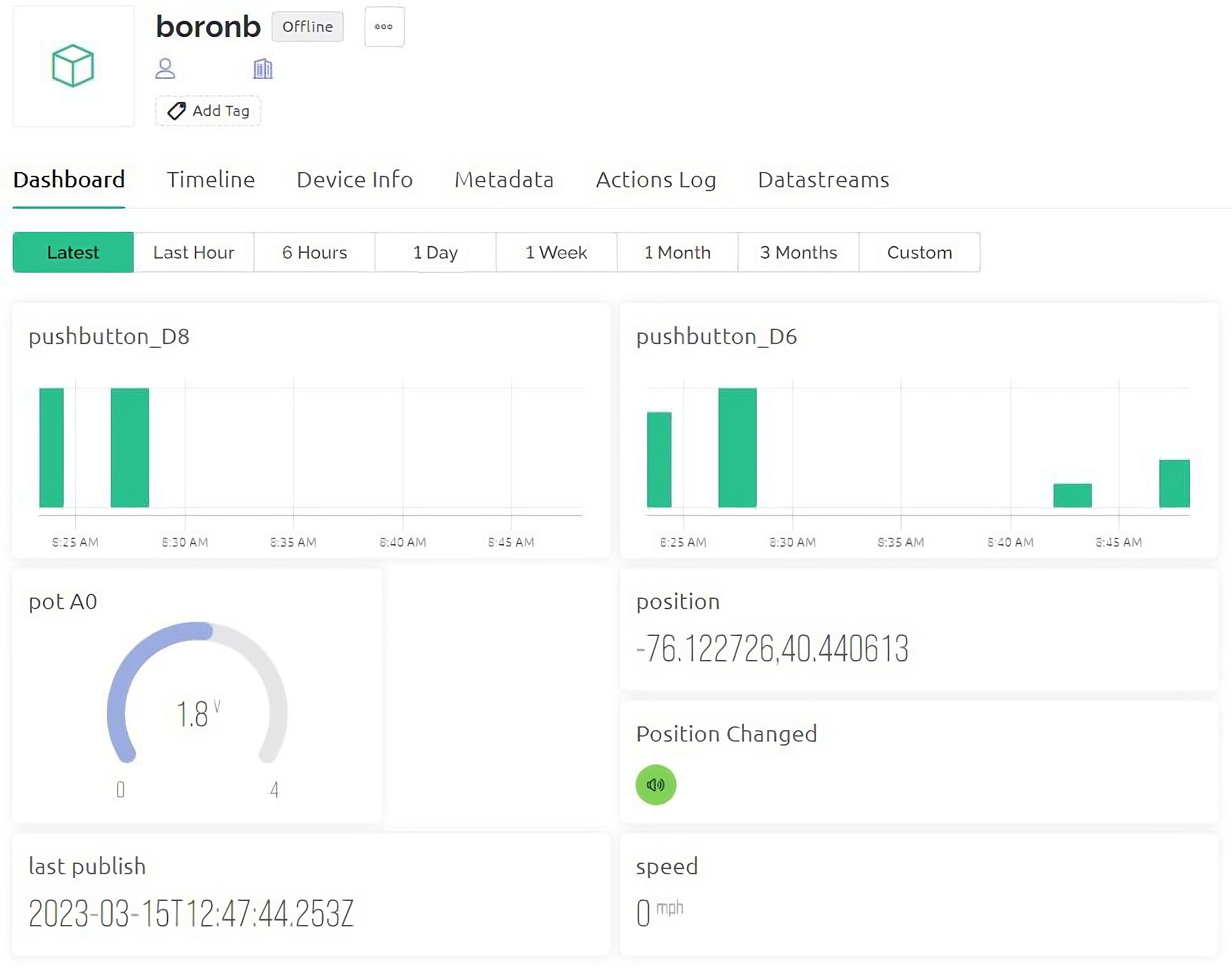 The datastream V5 named ‘position_changed’ is assigned to the Blynk Alarm & Sound widget. When the Blynk datastream is changed to a value of one (1), the widget on the Blynk dashboard will signal with an alarm. The device updates that datastream when it detects it has moved more than 122 m / 400 ft since it was powered on. You can trigger this alarm manually by sending a Blynk HTTP GET with your browser as follows:
