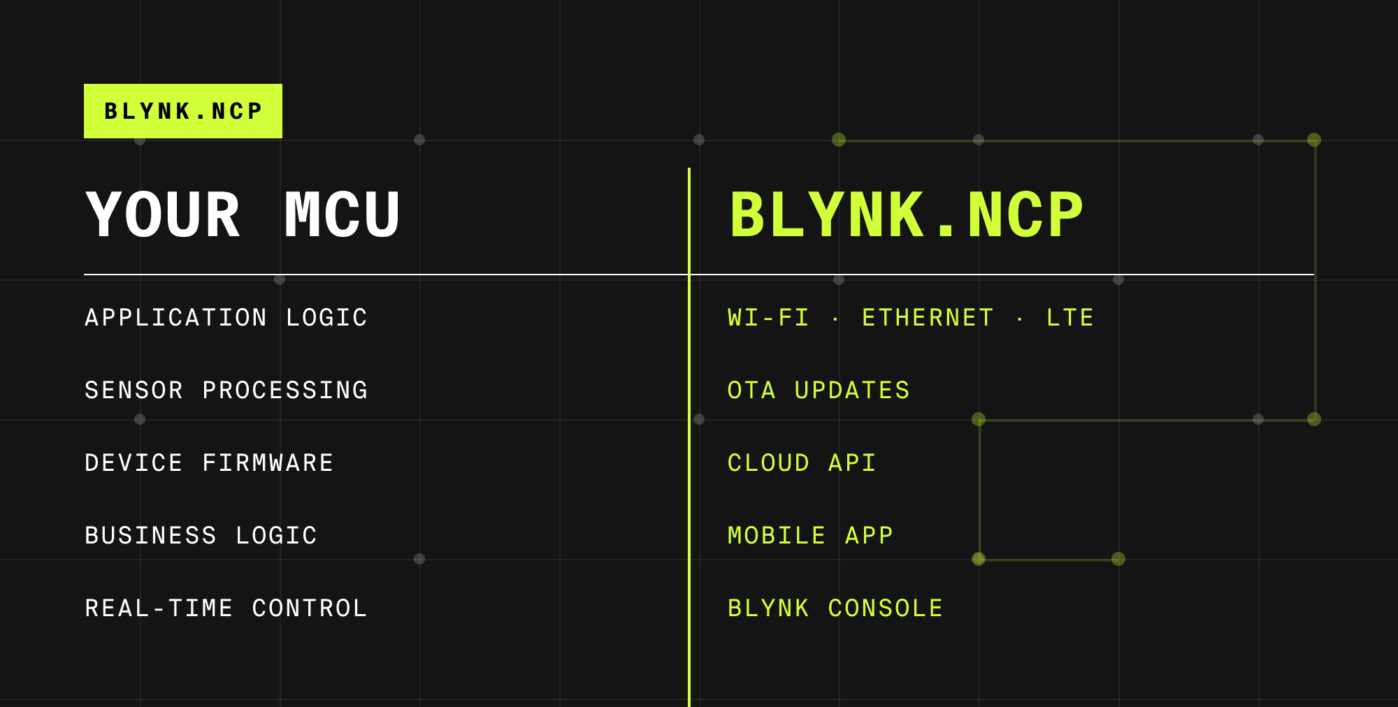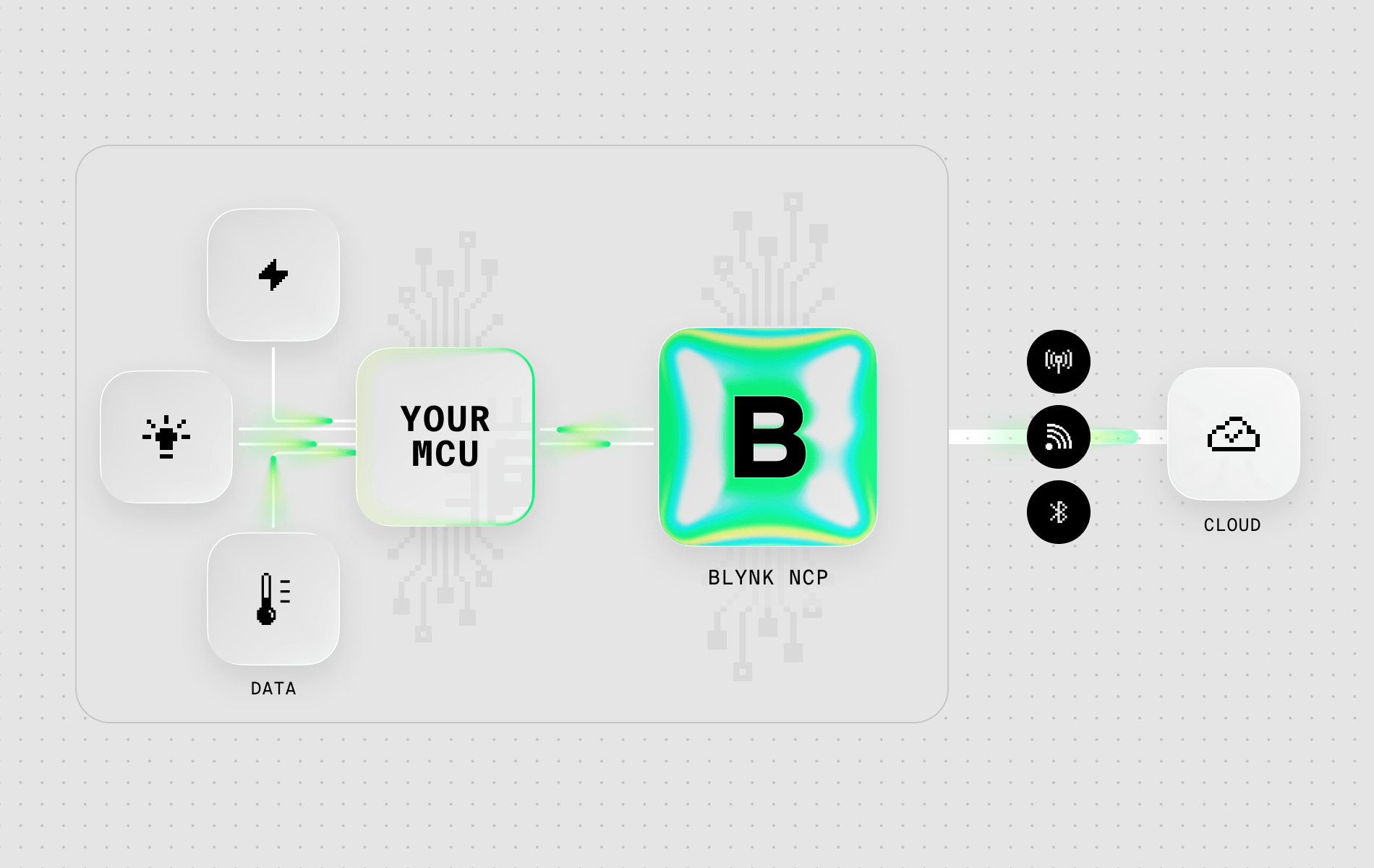 The NCP handles all cloud communication: Blynk session management, TLS encryption, authentication, and reconnection. Your host MCU code stays focused on reading sensors and controlling actuators.