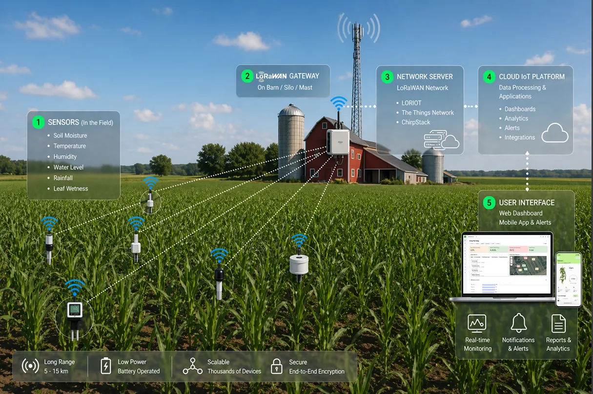 This is where LoRaWAN fits. A single LoRaWAN gateway covers 5-15 km in rural areas (further with line-of-sight over flat farmland). Sensors transmit small data packets using milliwatts of power, giving battery life measured in years rather than weeks. A farm deploys one gateway on a barn roof and covers every field, every water tank, every outbuilding.