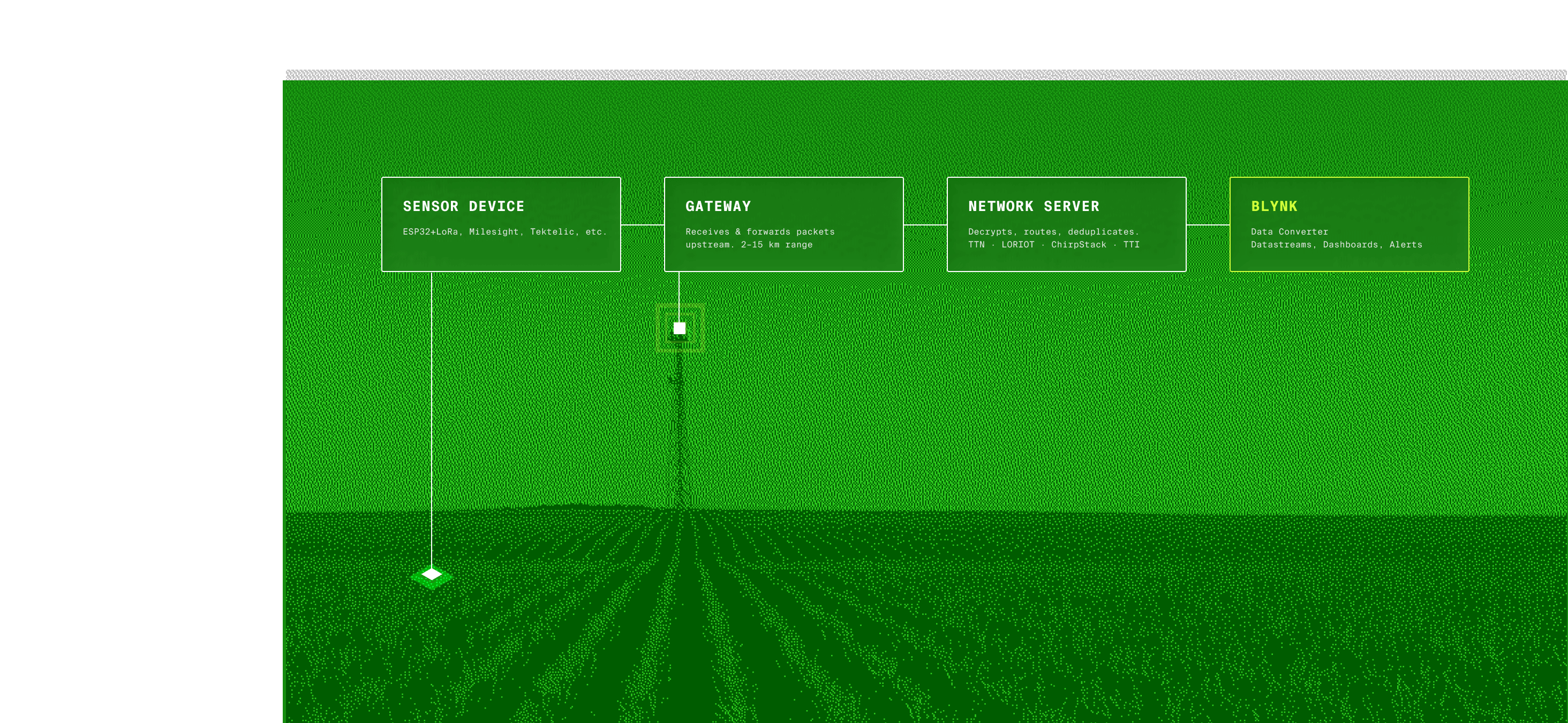 The pattern is the same regardless of which LoRaWAN hardware or network server you're using: device transmits, network server routes, Data Converter parses, Blynk displays. If you've already connected devices to Blynk over Wi-Fi or cellular, the dashboard and app side works exactly the same.