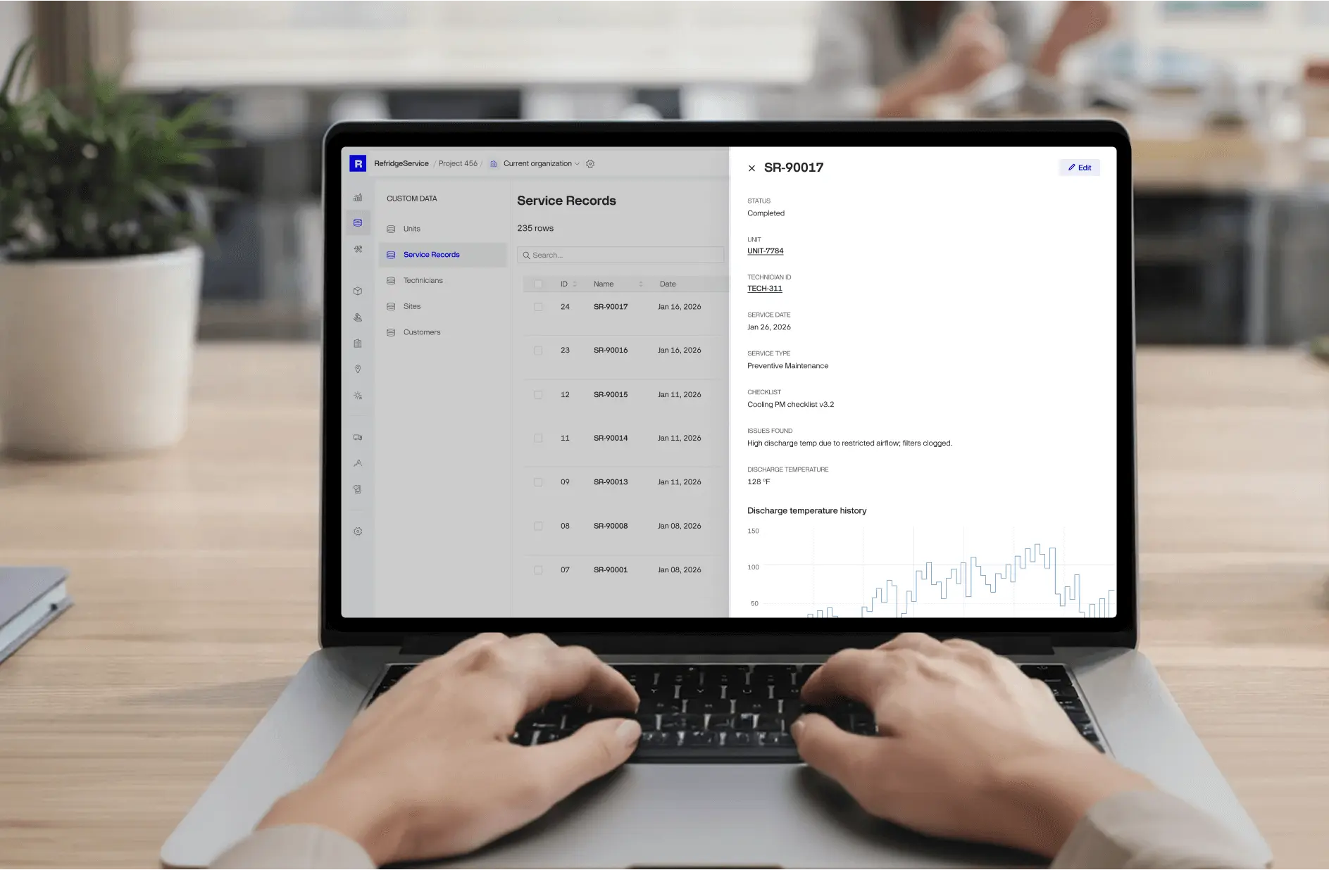 When an issue occurs, the full context is immediately visible: which client, which site, which unit, recent service history, refrigerant charge trends.