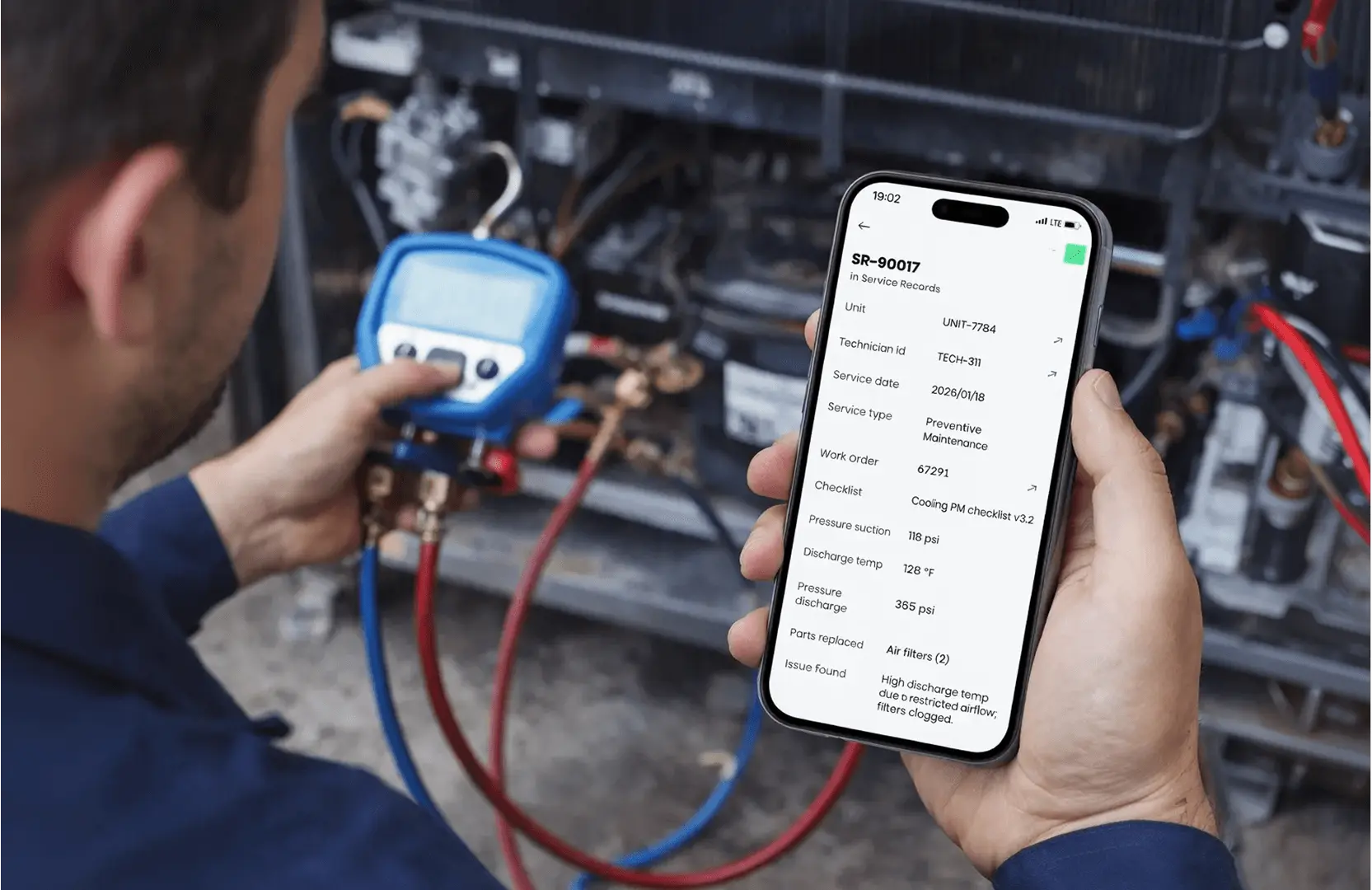 When a technician arrives on site, they need more than a work order. They need the unit's history, its equipment specs, and the standardised procedures that apply. When discharge temps run high or refrigerant pressure drops, the office needs to trace back: who serviced it last, what readings were taken, what parts were used.