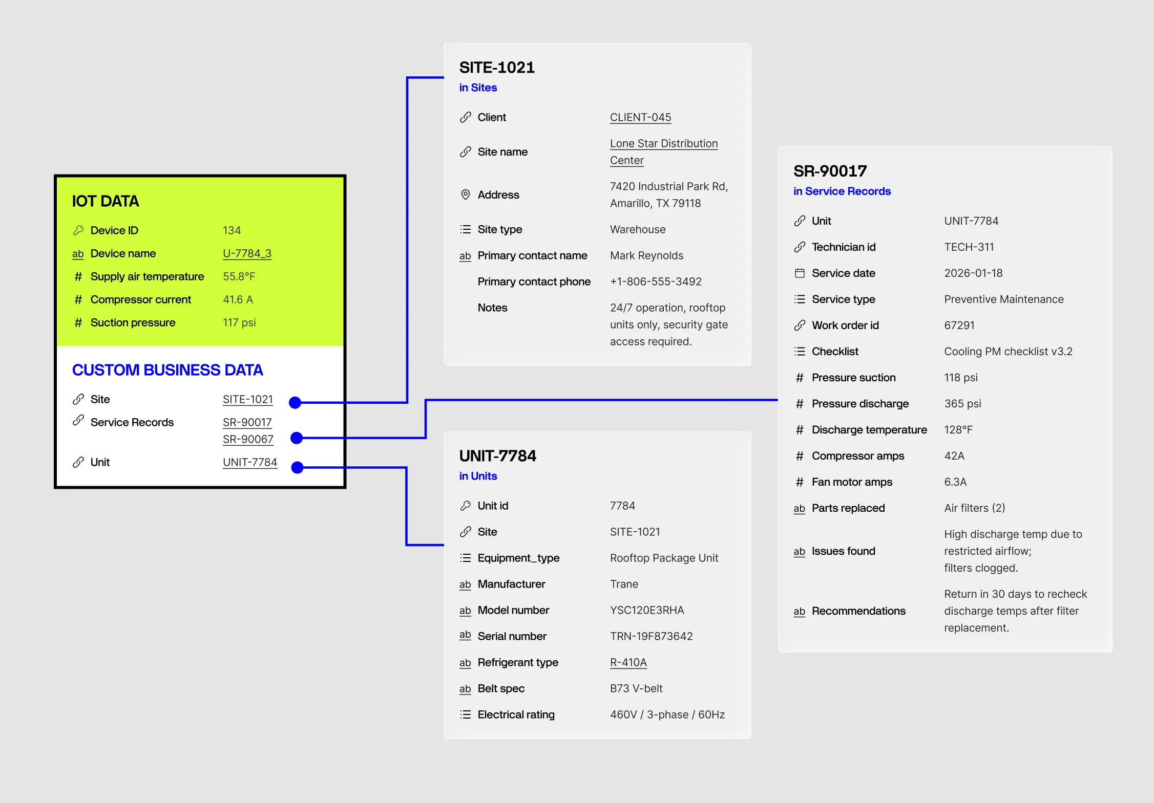 Every device in the system has a clear relationship to the business entities that matter. A sensor isn't just "Device #4521." It's the discharge temp sensor on Building 3's rooftop unit, last serviced on December 19th, currently showing 185°F against a threshold of 200.